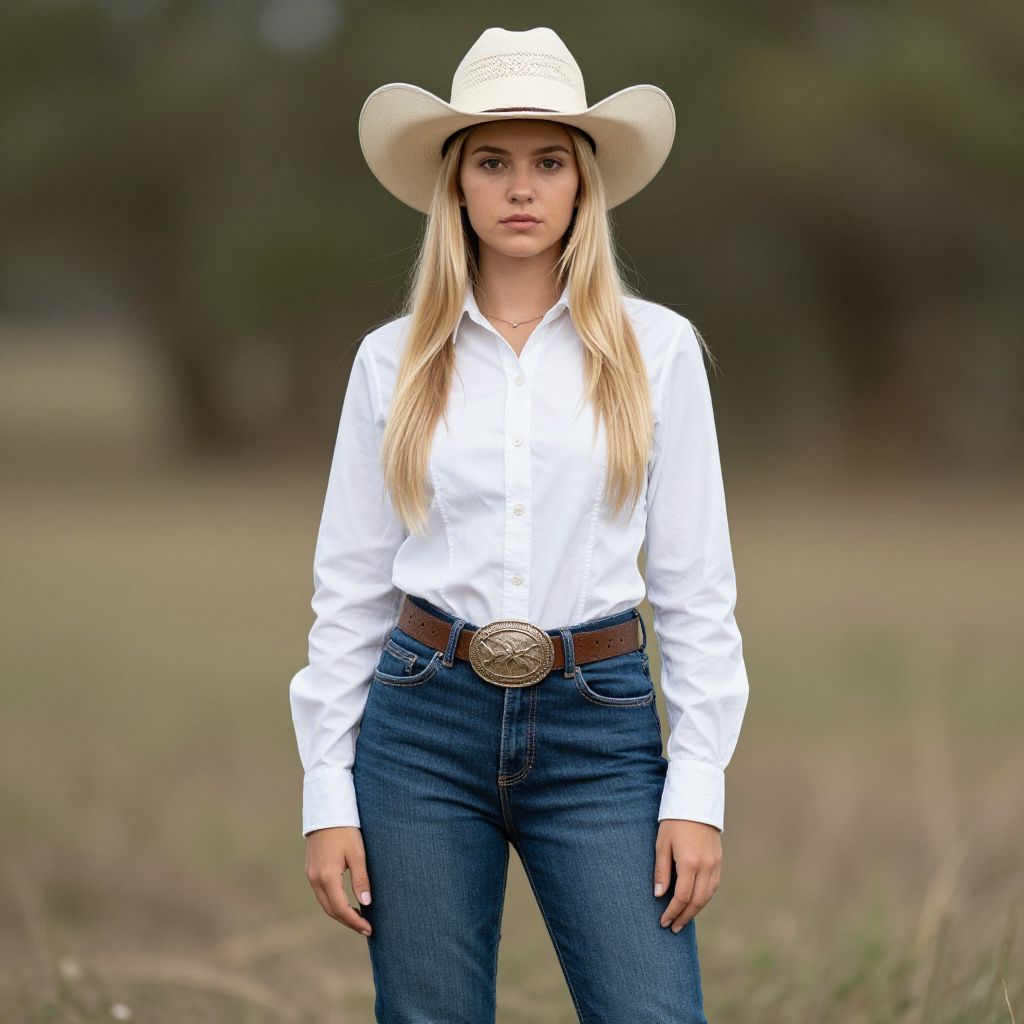 Photograph of a young Caucasian woman with long, straight blonde hair wearing a white cowboy hat, a white long-sleeve button-up shirt, and high-waisted blue jeans. She has a serious expression and is standing with her hands by her sides. She wears a brown leather belt with a large, ornate silver buckle. The background is a blurred, grassy outdoor setting with trees, suggesting a rural location. The image has a natural, daytime light with a slightly overcast sky. The woman's attire and hat evoke a classic Western style.