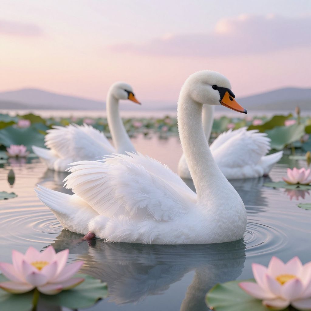 White chicks dressed in elegant swan outfits, floating gently on a mirrored lake surrounded by blooming lotus flowers, soft pastel sky at sunset, smooth and flowing lines in feathers and fabric, capturing a delicate and enchanting mood.