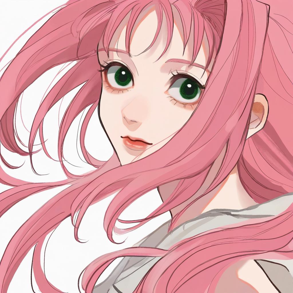 This is a digital anime-style drawing of a young woman with long, flowing pink hair and large, expressive green eyes. She has fair skin with a slight blush on her cheeks and a subtle smile on her lips. Her hair is dynamic, sweeping across her face and shoulders, creating a sense of motion. She is wearing a white top, but the focus is on her face and hair. The background is plain white, making her vibrant hair and eyes stand out prominently. The artwork has a clean, polished look with smooth lines and soft shading.