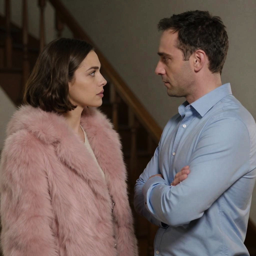 Photograph of a man and woman standing closely, facing each other. The woman, with short brown hair, wears a pink fur coat, looking intently at the man. The man, with dark hair and a receding hairline, wears a light blue shirt, also looking at her. They stand in a dimly lit room with wooden stairs and a blurred background. The man's arms are crossed, and they are chest-to-chest. Intense expressions.
