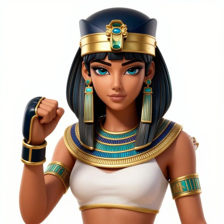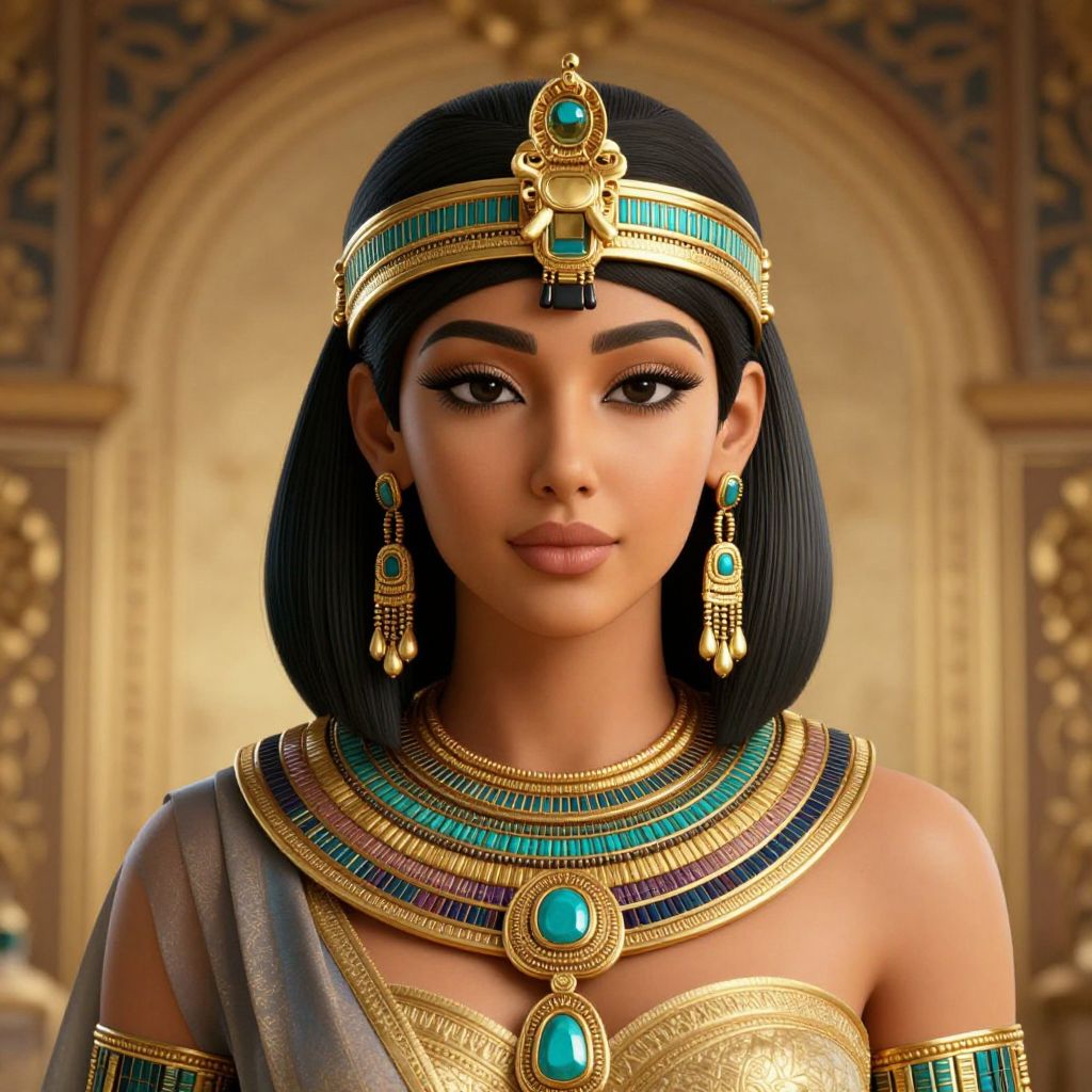 A digitally rendered portrait of a woman adorned in opulent Egyptian-inspired jewelry and attire, featuring intricate gold headpieces, dangling earrings, and a richly detailed necklace, set against a warm, ornate backdrop with golden hues and vintage aesthetic.