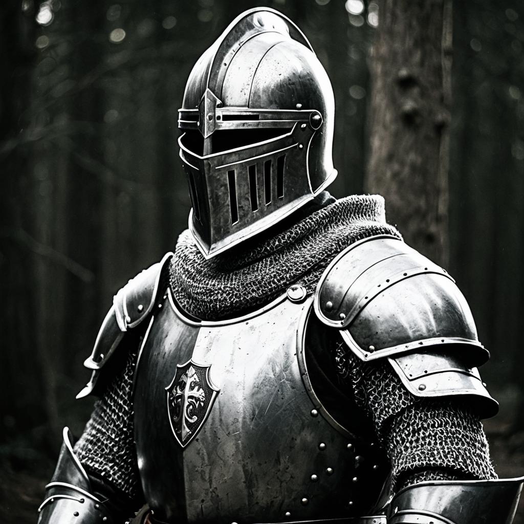 Detailed character illustration of a knight in full shiny armor with gold accents, holding a sword. The knight wears a helmet with a visor, layered shoulder guards, and a belt holding a scabbard. The background features a smooth gradient from gray to beige.
