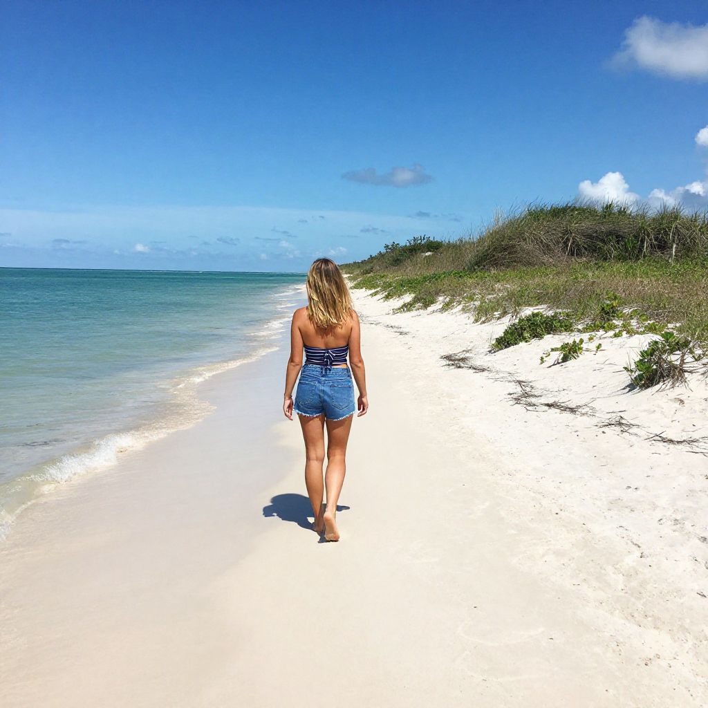 Woman walking along Gasparilla Island's pristine beach in Boca Grande, Florida, with turquoise waters and lush green dunes stretching into the horizon under a vibrant blue sky.