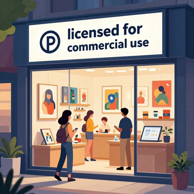 Can you use DALL-E images for commercial use? Illustration of a digital storefront featuring DALL-E AI-generated artworks for sale, with a prominent sign indicating 'licensed for commercial use', blending modern e-commerce and AI creativity themes in a detailed style.