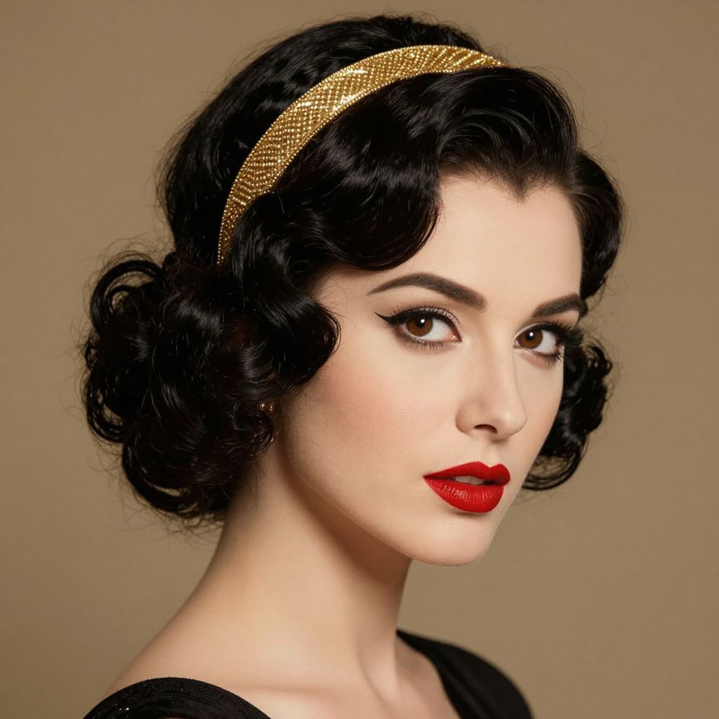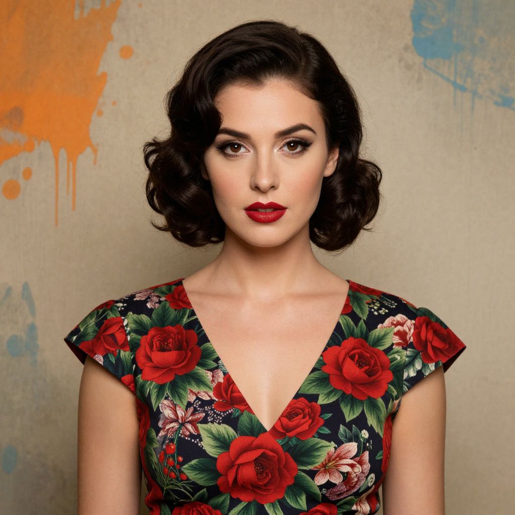 A vintage-inspired digital artwork featuring a woman with dark, wavy hair adorned with red bows, wearing a red dress with ruffled details and a gold necklace, set against a pastel-green backdrop with ornate patterns, evoking a classic 1913 aesthetic reminiscent of Christina Marvyn O'Gorman's style.