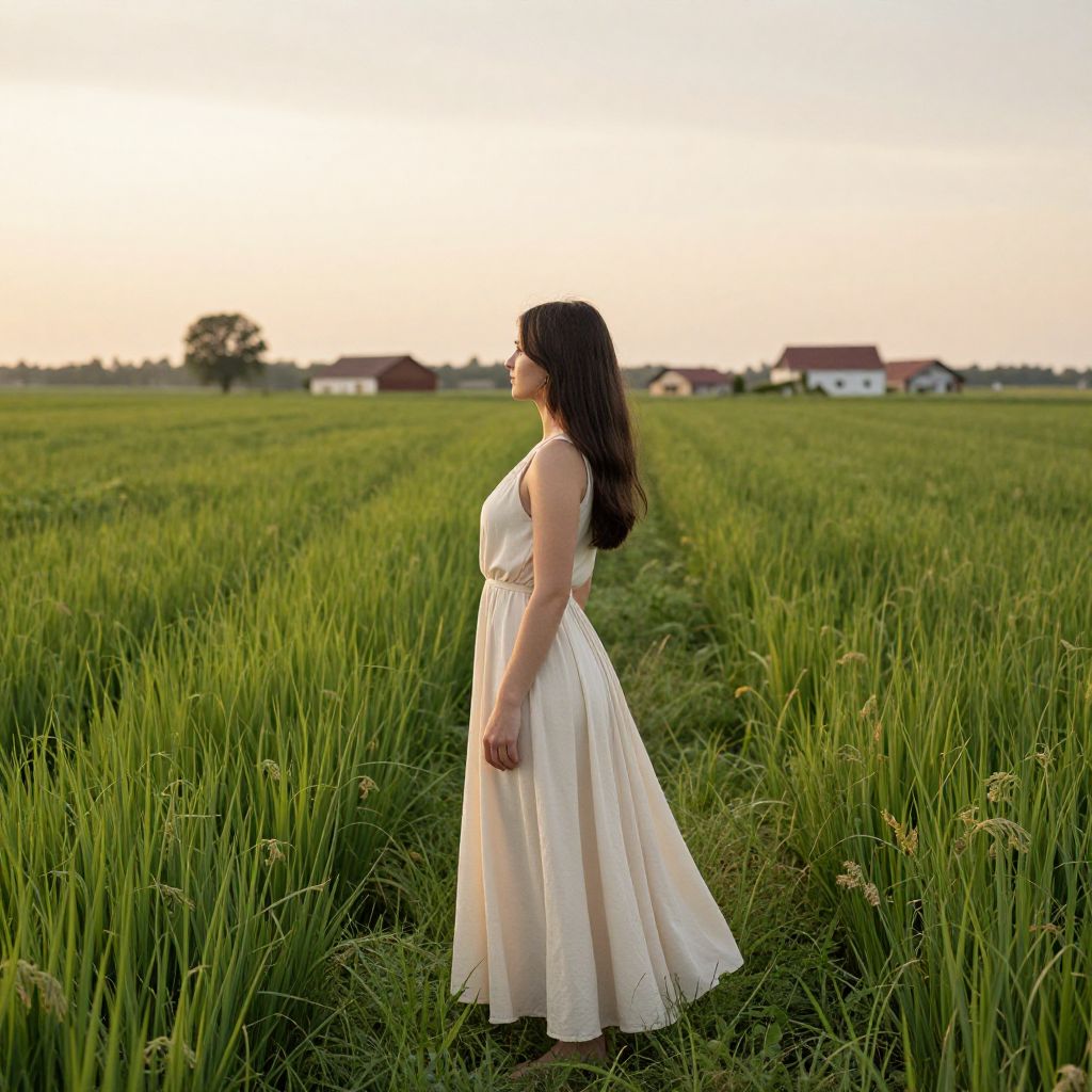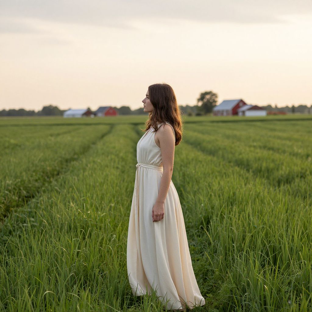Woman in a flowing cream dress stands gracefully in a serene rural landscape, her profile framed by lush green fields and distant farmhouses under a soft, golden sky.