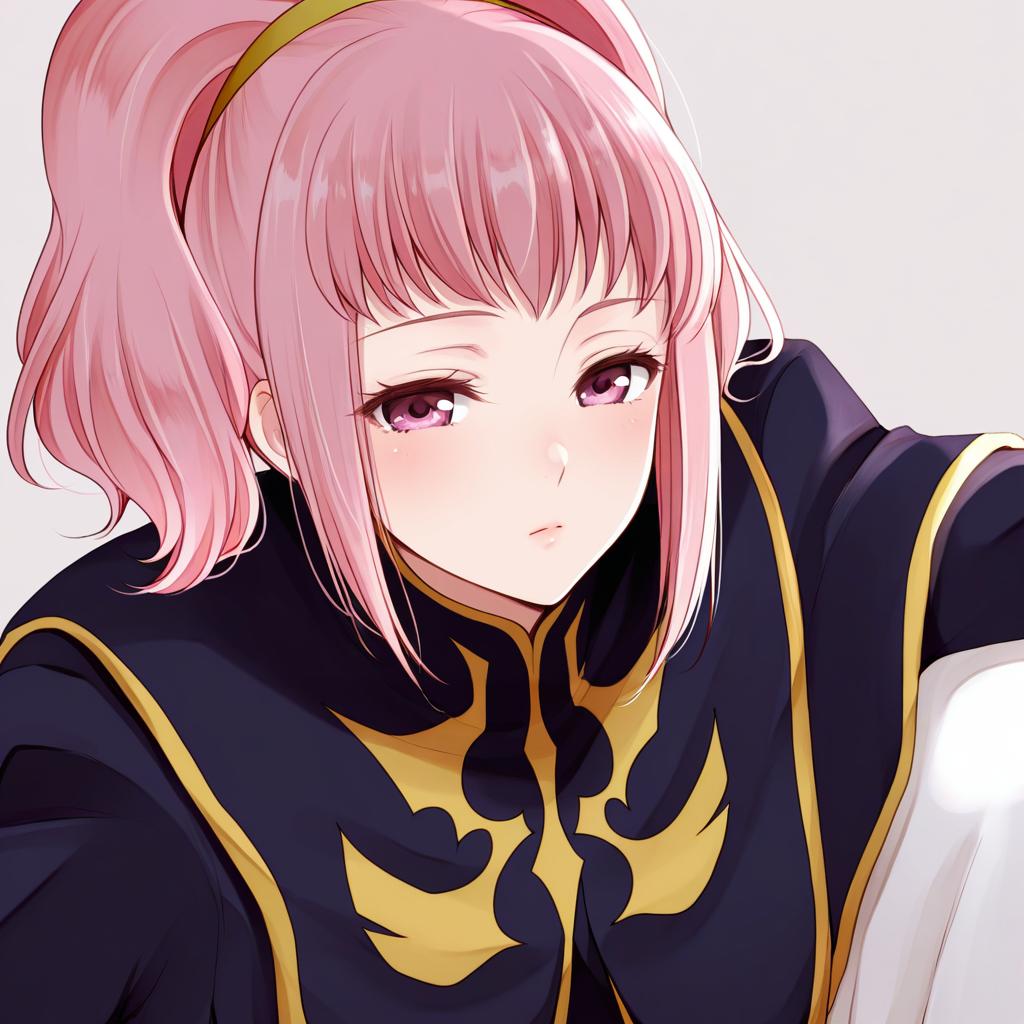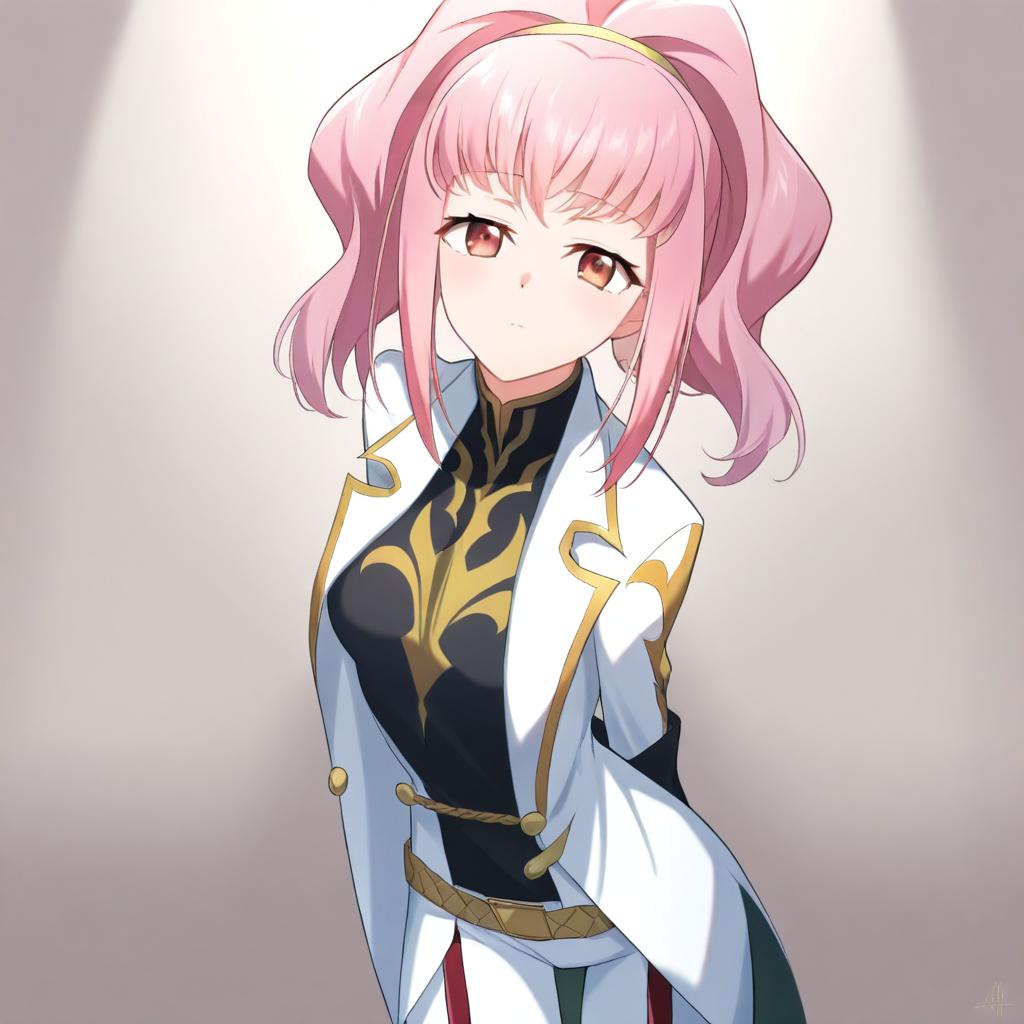 Anya alstreim, code geass, 1girl, red eyes, pink eyes, pink hair, knights of the round uniform, by artist akahi242, animagine