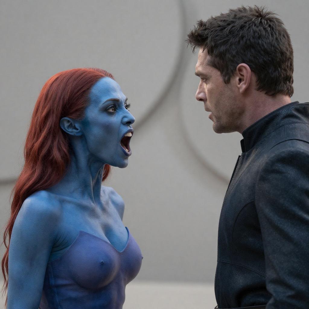 Photograph of a group of nine people, mostly in dark clothing, with intense expressions. Central figure is a nude woman with blue, scaly skin and red hair, standing confidently. Background has geometric patterns. Several people wear black leather. Bald man in suit stands left. Mixed genders, muscular and slender physiques. Lighting creates dramatic shadows.
