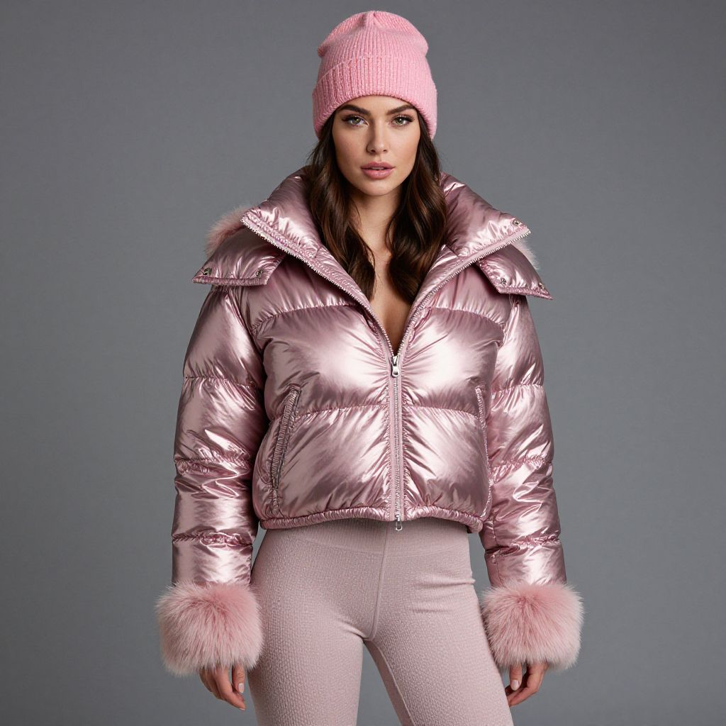 "Woman, modern winter chic, glossy metallic pink puffer jacket with oversized collar, matching pink beanie, coordinating faux fur muff, slim-fit textured leggings in a lighter pink shade, photo studio background.. Sexy. Pretty face and beаutiful eyes. Big breasts."