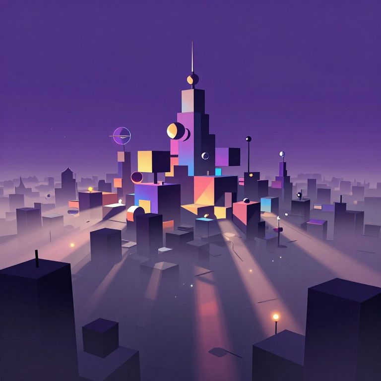 A futuristic cityscape arises from an enigmatic mist, reminiscent of surreal melting geometries. From a high vantage point, the viewer surveys a skyline composed of interlocking cubes and spheres, their forms pulsating with shifting colors that create a living mosaic beneath a deep purple sky. These abstract elements evoke a sense of awe, unease, and curiosity as they merge into a harmonious landscape, where soft glows from distant lights cast elongated shadows across the angular terrain, blurring the line between reality and the dreamlike realm.