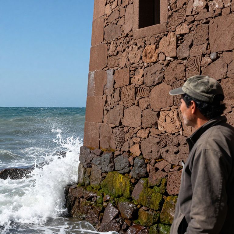 Photograph of a man in a gray cap and jacket standing near a stone seawall. The seawall, composed of large, reddish-brown stones with intricate carvings, stands on the right side of the image. Ocean waves crash against the base of the wall, creating white foam. The man is seen from the side, facing the water. The sky is clear and blue, contrasting with the dark, choppy sea. The texture of the stone wall is rough, while the man's clothing appears smooth. The scene is brightly lit by sunlight.