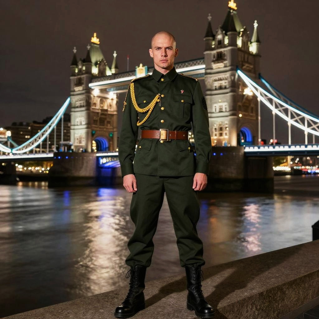 Photograph of a bald, serious-looking man standing in front of the illuminated Tower Bridge in London at night. He is wearing a dark green military-style uniform adorned with gold chains, a brown belt, and black combat boots. The brightly lit towers of the historic bridge and their reflections are visible in the river Thames, contrasting with the dark night sky.