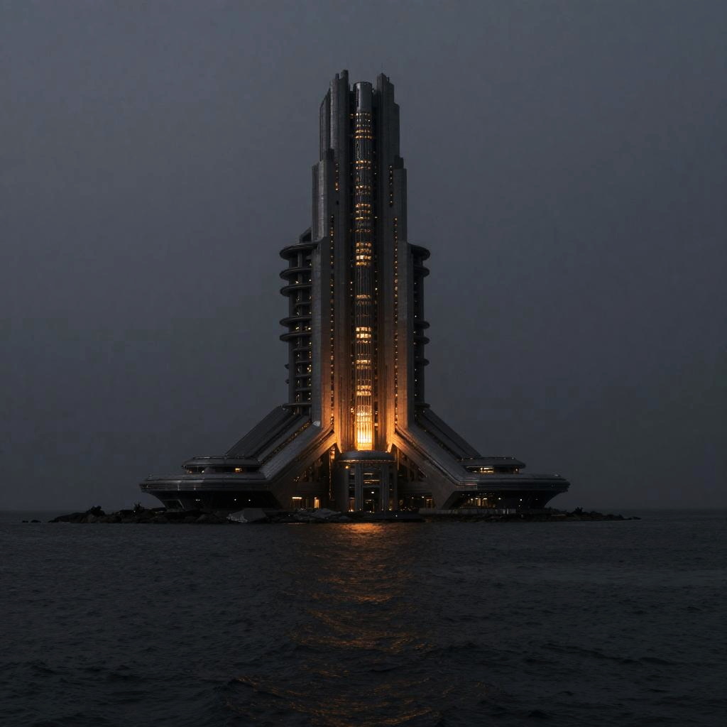 Photograph of a futuristic, towering, illuminated structure standing alone on a dark, calm ocean at dusk. The structure features multiple vertical, sleek, metallic columns with glowing orange lights at the base, creating a striking contrast against the deep blue and purple twilight sky. The structure has a symmetrical design with horizontal platforms extending from the central columns. The water reflects the orange light, adding a warm glow to the otherwise dark scene. The overall aesthetic is futuristic and sci-fi, with a minimalist yet imposing presence.
