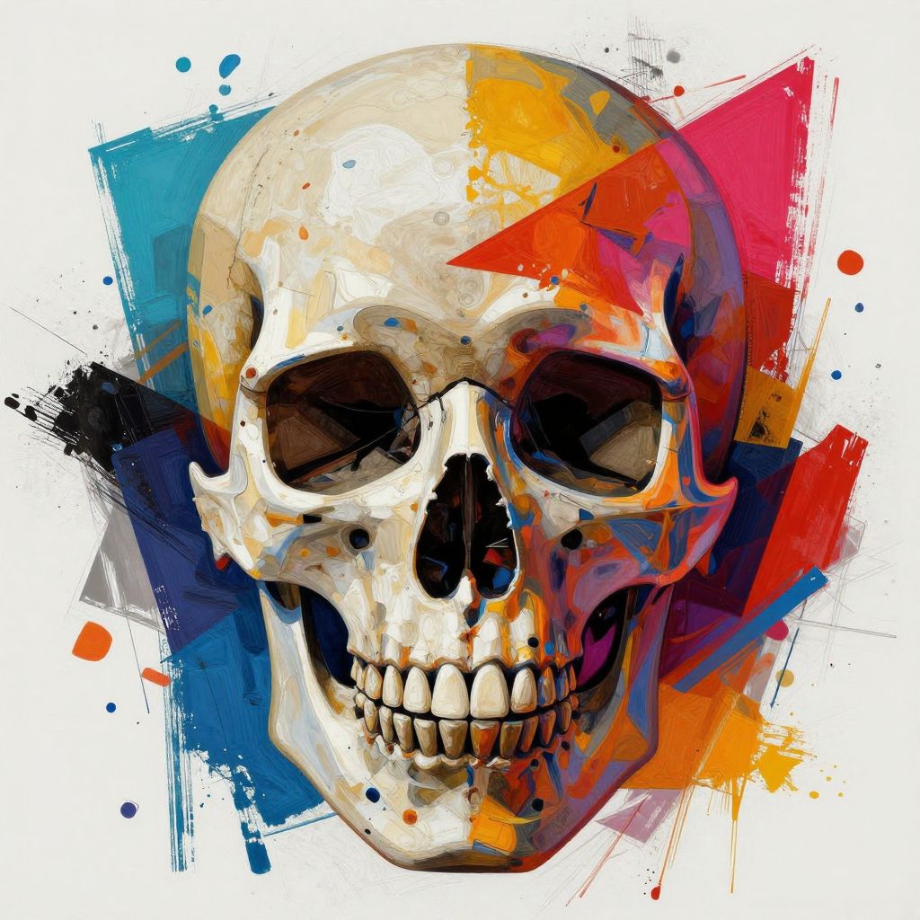 Digital artwork of a human skull with a vibrant, abstract background. The skull is rendered in shades of white and beige, with dark, hollow eye sockets and nasal cavity. Bright, bold splashes of blue, red, orange, and black paint surround the skull, creating a dynamic, energetic contrast. The skull's teeth are prominently displayed, and its texture appears slightly worn. The background features splatters and brush strokes, adding a sense of movement and intensity to the piece. The overall style is modern and abstract, with a vivid, colorful palette.