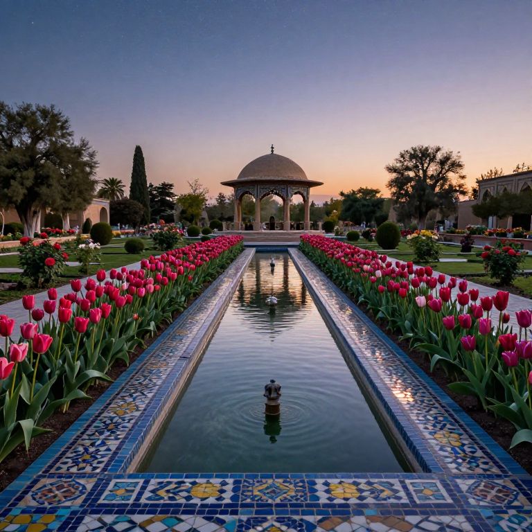 Gpersia, a serene Persian garden with symmetrical water channels, blooming tulips and roses, ornate tiled pavements, and mosaics reflecting sunlight, with a peaceful pavilion under a twilight sky full of stars.
