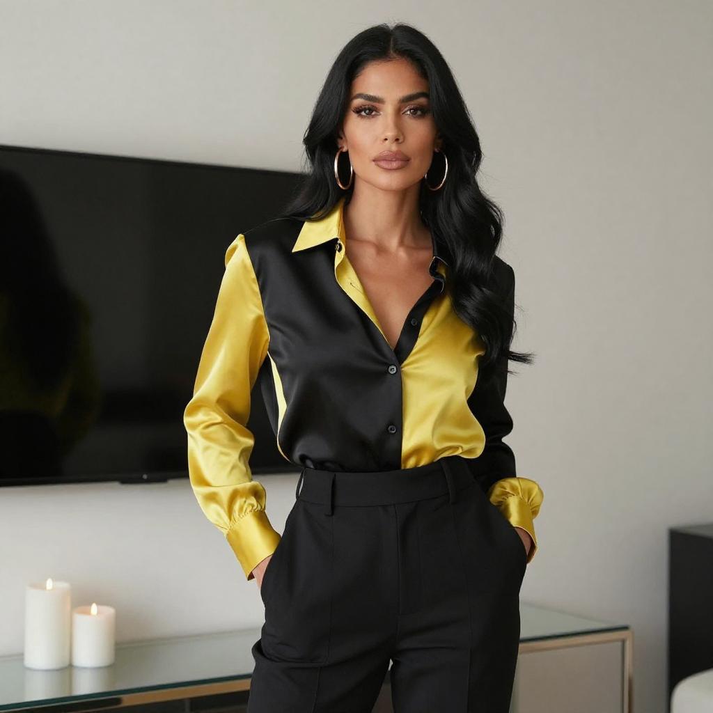 Photograph of a woman with long black hair, wearing a black and yellow satin blouse with a deep V-neck, black high-waisted pants, and large gold hoop earrings. She stands in a modern room with a flat-screen TV, white candles, and a glass side table. Her hands are in her pockets, and she gazes confidently at the camera.