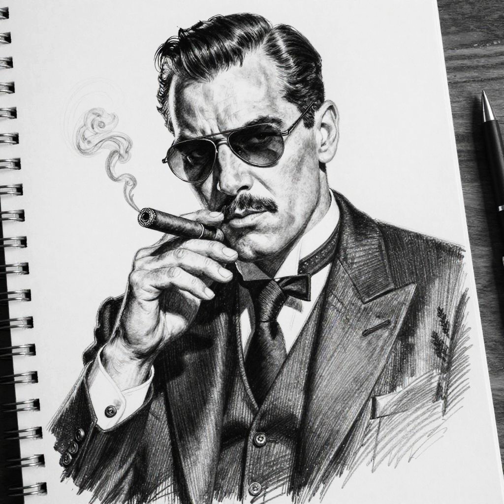 Mafia boss drawing, detailed black and white sketch of a powerful mafia boss in a classic suit, vintage style, cigar in hand, intense gaze, noir atmosphere