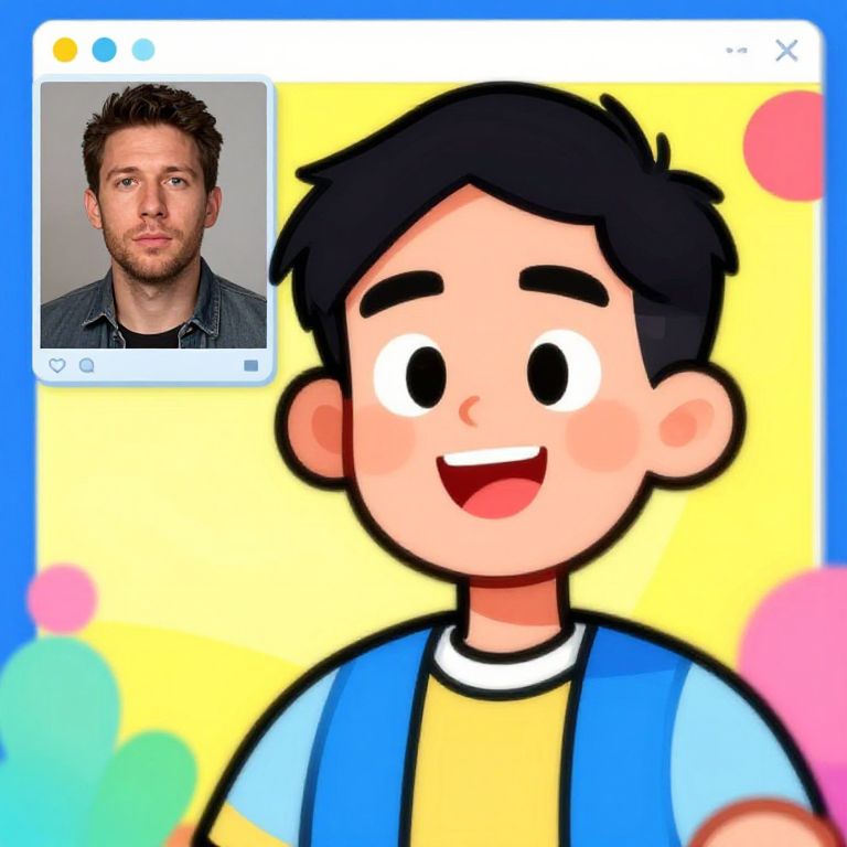 Picture to cartoon online, vibrant digital transformation of a realistic photo into a colorful cartoon style with bold lines and exaggerated features, playful background, bright and cheerful colors, modern interface elements