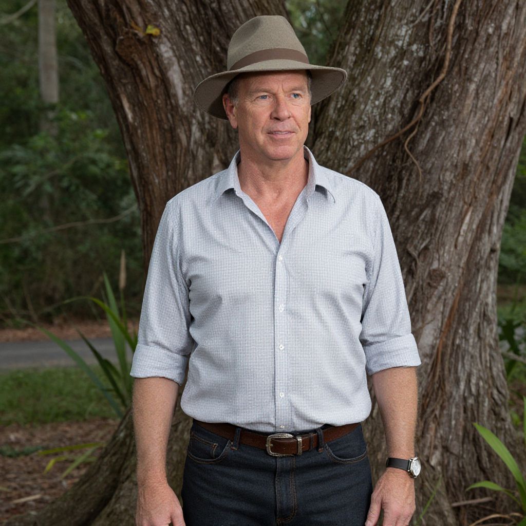 Photograph of a middle-aged white man standing outdoors against a large tree with textured bark. He has short, light brown hair and is wearing a beige fedora hat, a light gray checkered button-up shirt with the top button undone, and dark blue jeans with a brown leather belt. He is also wearing a silver wristwatch on his left wrist. The background features green foliage and a blurred path. His expression is neutral, and he is looking directly at the camera. The lighting is natural, highlighting his tanned skin.