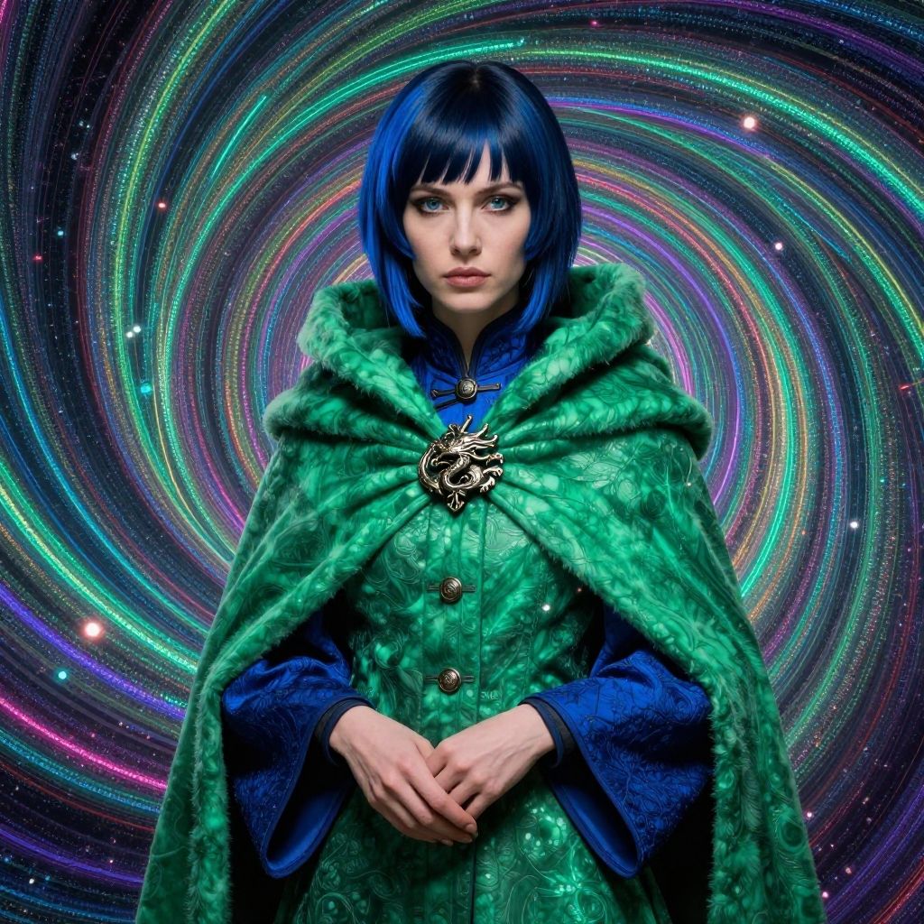 Fuchsia outline of spiral Honored Hierarch in a Jade Woolen cloak fastened with a pewter brooch shaped like a dragon blue sleeves, Blue black hair retro cyberpunk . 80├в┬А┬Щs inspired, synthwave, neon, vibrant, detailed, retro futurismPatrick Dougherty, natural, shimmering, gothic, rpg, 1400ad, ultra detailed, immersive, reminiscent of high fantasy RPG games, HD, masterpiece, best quality, hyper detailed, super realistic, perfect face, perfect hands, award-winning, professional, breathtaking
