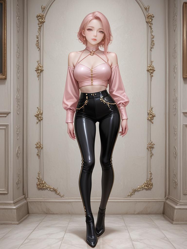 A digital CGI image of a slender, fair-skinned woman with short, pink hair. She wears a shiny, pink, long-sleeve crop top with puffed sleeves and high-waisted, black, glossy leather pants. A thin chain hangs from her waist. She stands in an ornate, white-walled room with gold decorative accents and framed pictures on either side. Her expression is neutral, and she gazes directly at the viewer. The floor is white marble, and the lighting is soft, highlighting her outfit and the room's details.