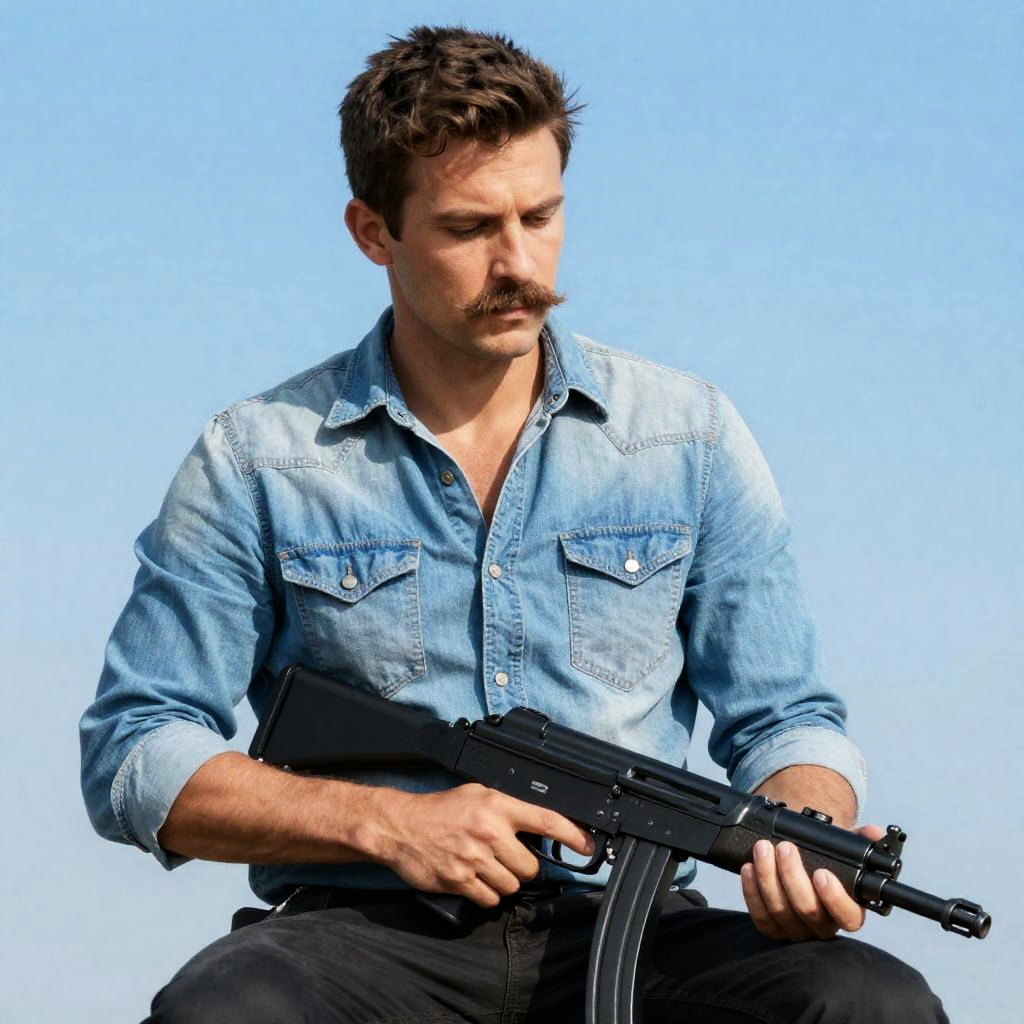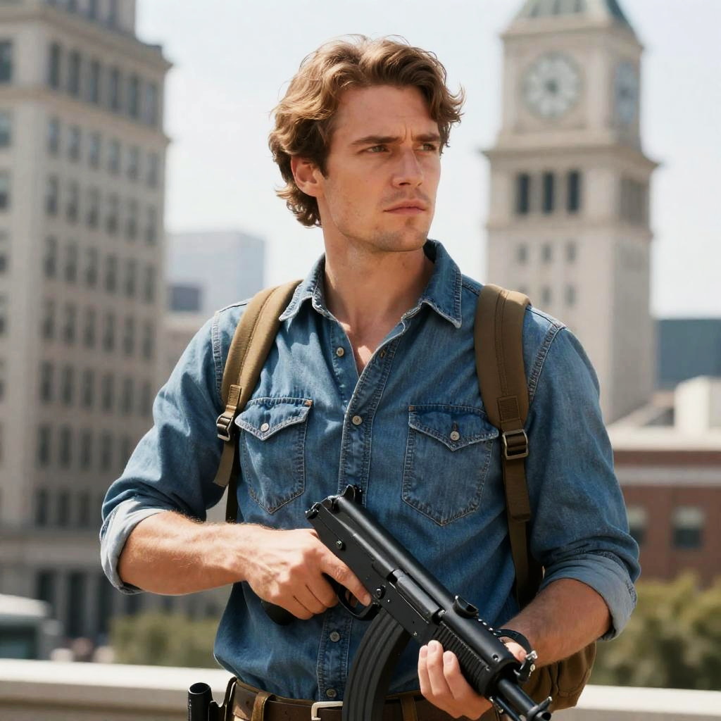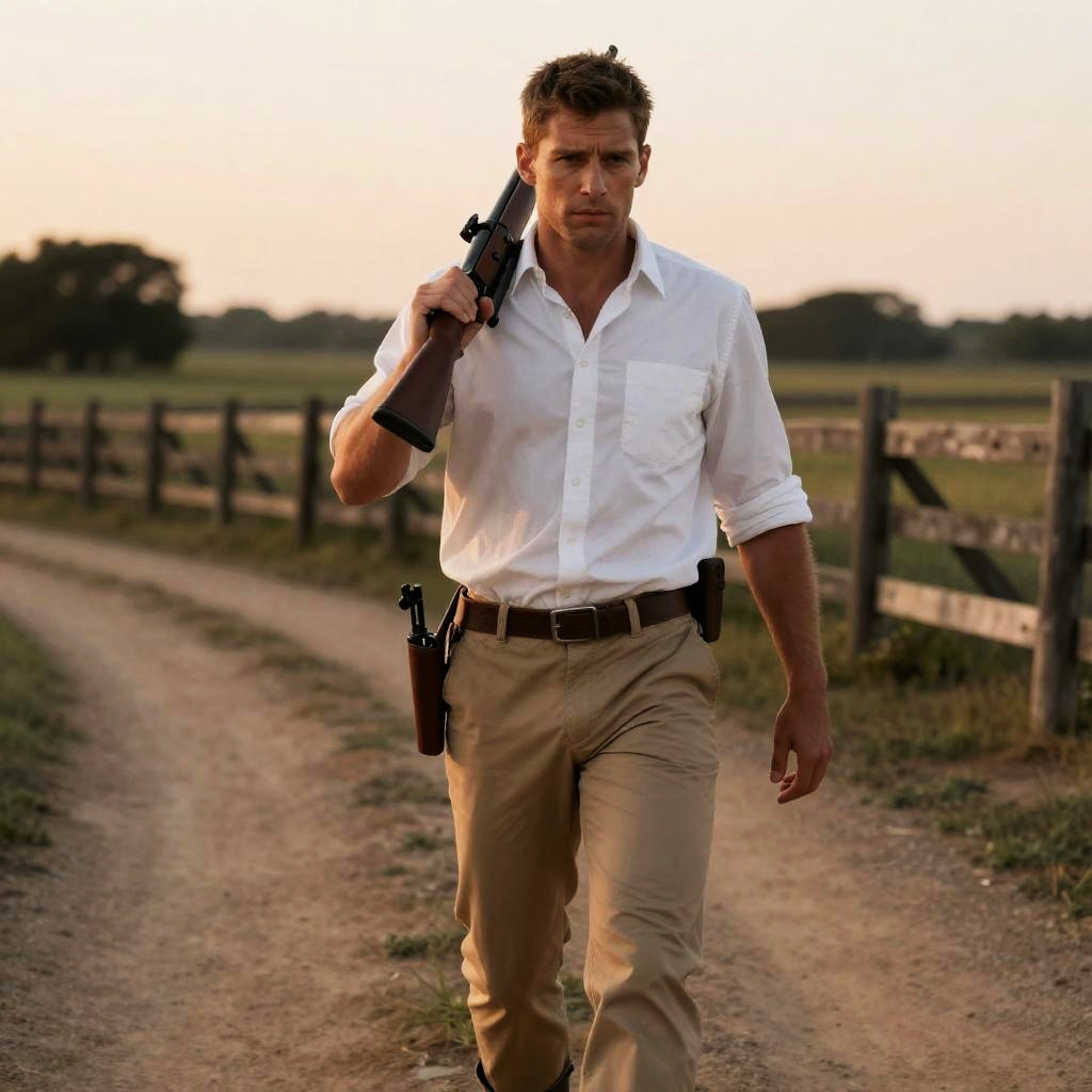 Man with short brown hair, white button-up shirt, beige pants, and brown belt holster, carrying a rifle over his right shoulder. He walks on a dirt path, with a rustic wooden fence in the background. Intense gaze. Grass and distant trees. Warm, orange sky.