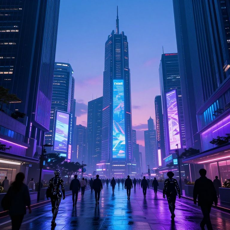Thinr, a futuristic cyberpunk cityscape at dusk, glowing neon signage, towering sleek skyscrapers with holographic advertisements, bustling streets filled with diverse cybernetic beings, reflective wet pavement, vivid blue and purple hues, cinematic lighting.