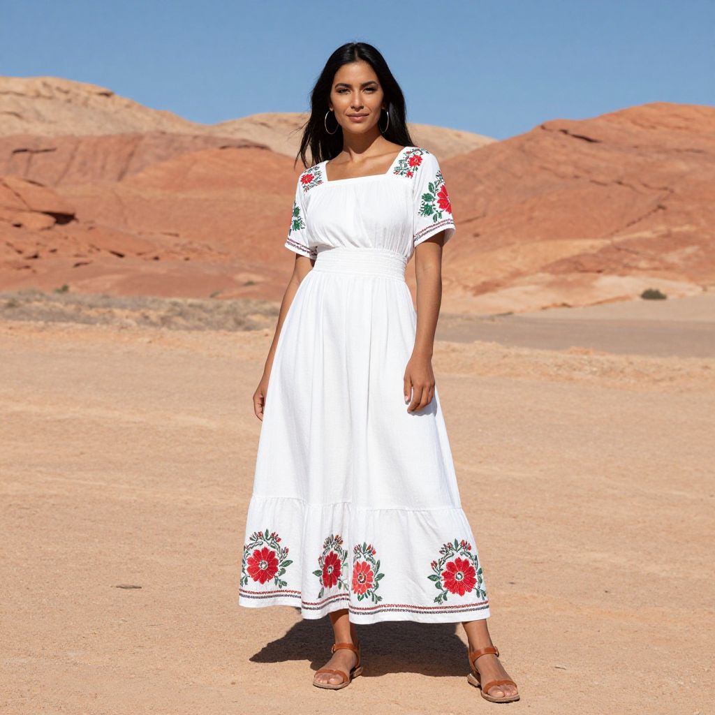Photograph of a woman standing in a desert landscape with red rock formations in the background. She has long dark hair, medium skin tone, and is wearing a white dress with red and green floral embroidery on the sleeves and hem. The dress has short sleeves and a full skirt. She's wearing brown sandals and large hoop earrings. The bright blue sky contrasts with the earthy tones of the desert.