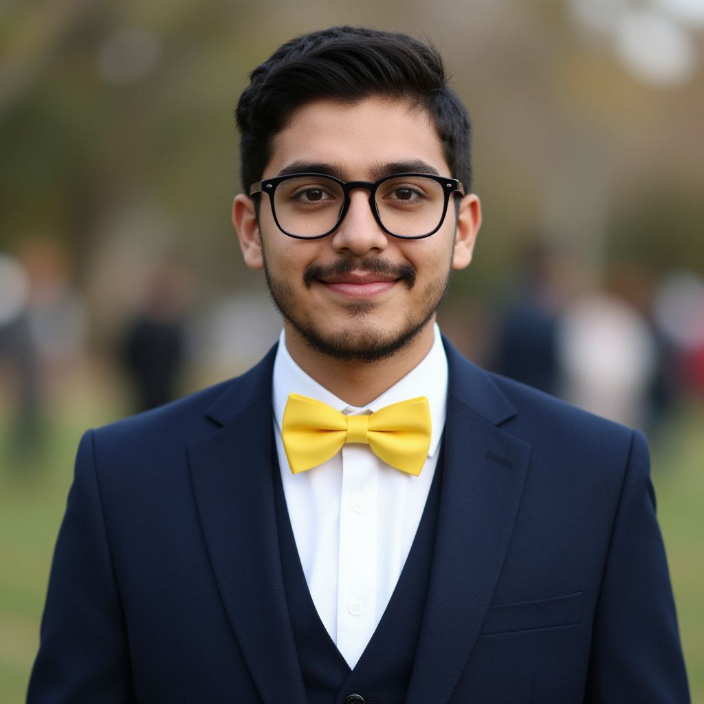 Photograph of a handsome, dark-haired man in a crisp white suit with a yellow flower in his black belt, standing confidently outdoors.