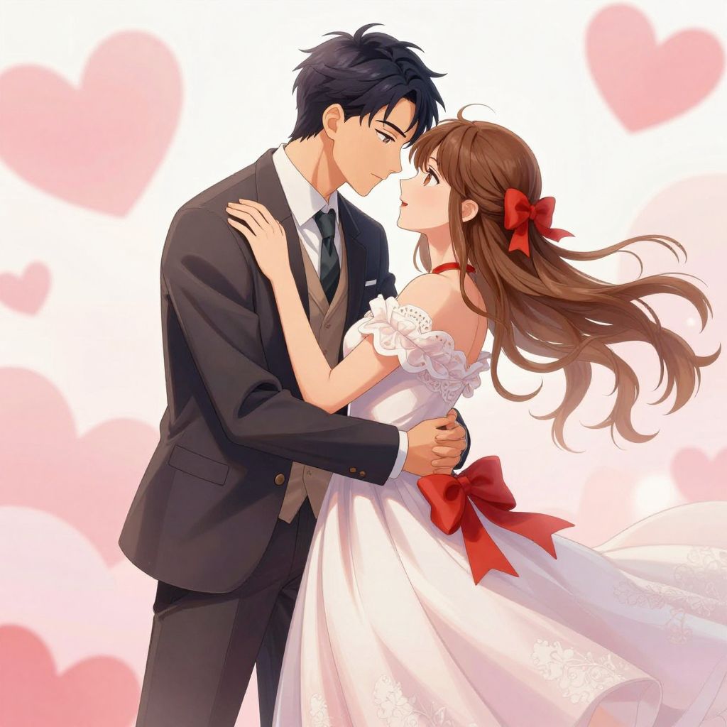 A vibrant anime-style illustration featuring a romantic embrace between a man in a formal suit and a woman in a flowing dress adorned with a red bow, set against a whimsical backdrop of floating hearts, showcasing high-definition digital art with a soft, dreamy aesthetic.