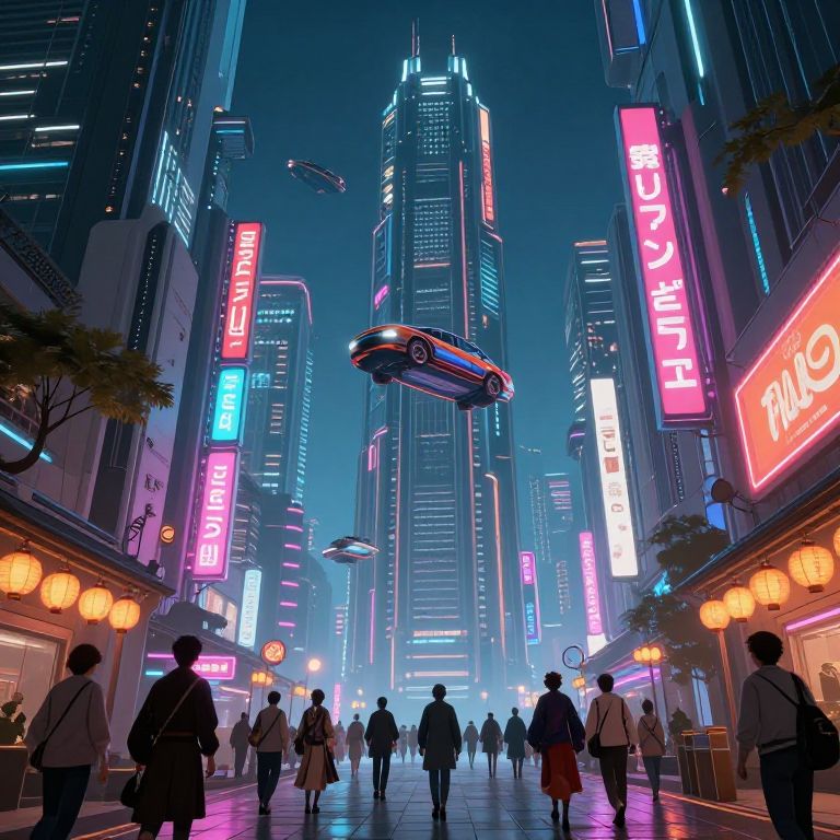 Futuristic cityscape with the theme of Ides, neon signs spelling out 'Ides', cyborg citizens in sleek metallic attire, reflective glass buildings, hovering vehicles, dusk sky with deep purple and orange hues, high detail cyberpunk aesthetic with dynamic lighting effects.
