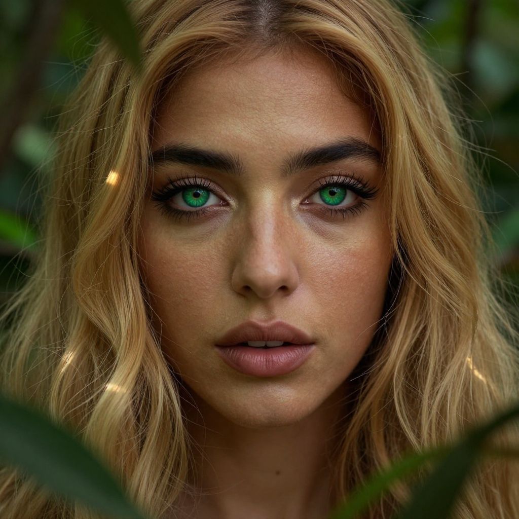 Photograph of a young woman with striking green eyes, framed by lush green foliage. She has long, wavy blonde hair, fair skin, and full lips with a subtle pink hue. Her facial features are symmetrical, with well-defined eyebrows and a slightly serious expression. The background is blurred, emphasizing her face, and small, golden light spots are visible near her hair. The image has a high contrast, bringing out the vividness of her eyes and the texture of her hair. The overall style is naturalistic with a slight surreal touch due to the green eyes and golden light accents.