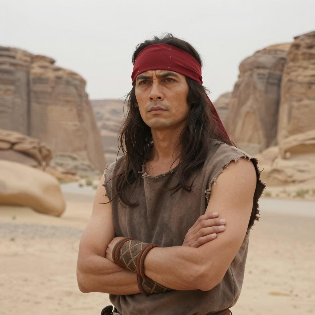 Man with long dark hair, wearing a red headband, sleeveless brown tattered shirt, and a diamond-patterned armband. Arms crossed, serious expression. Desert canyon background with large rock formations. Overcast sky. Midshot, slightly low angle. One person.
