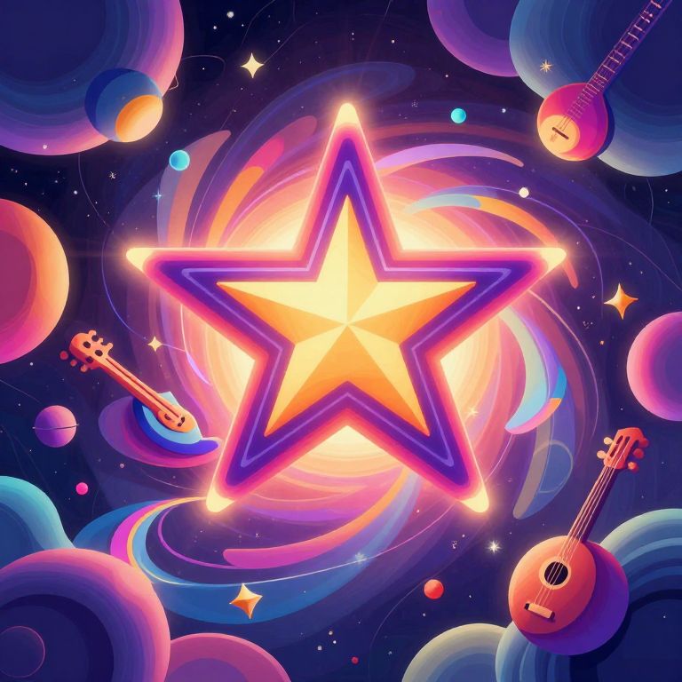 Bright neon star at center surrounded by colorful planets, guitars, and musical notes in a vibrant, cosmic, digital art style.