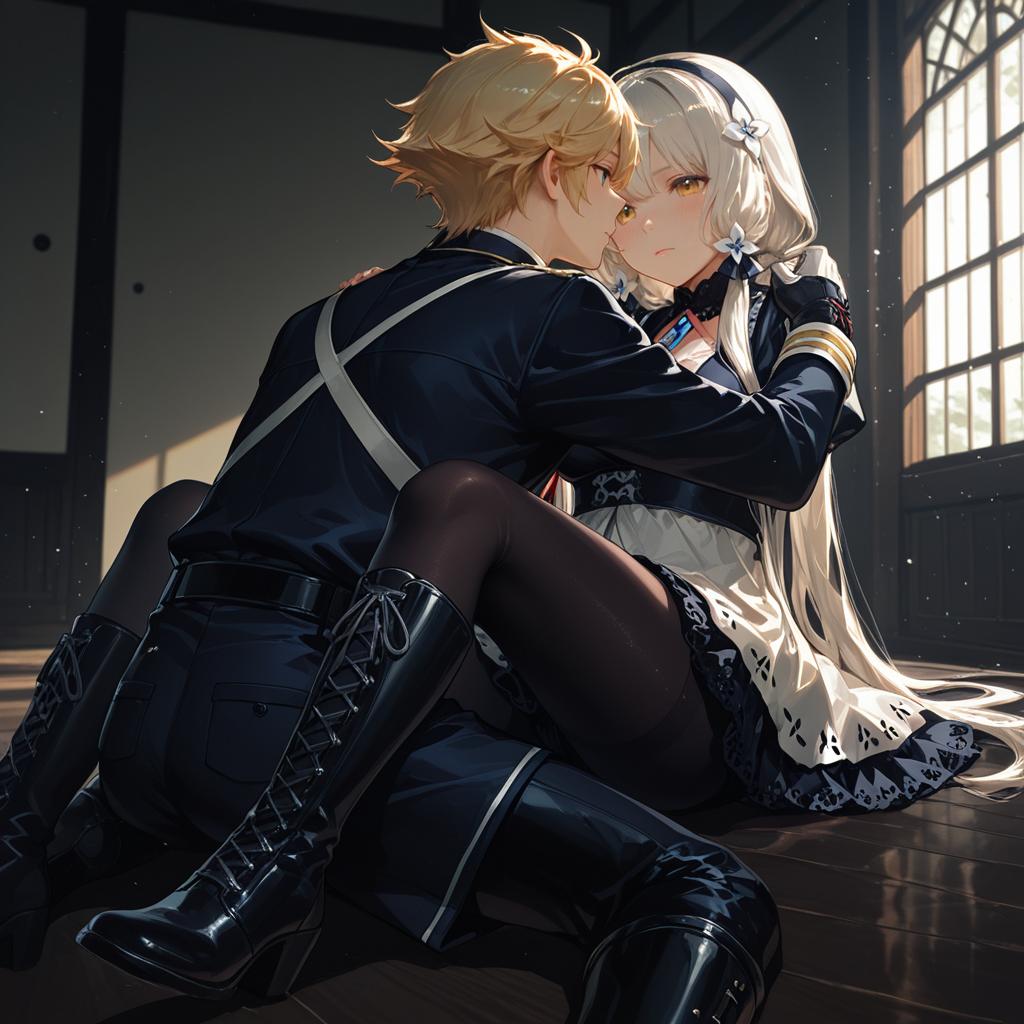 Monoyoshi sadamune, touken ranbu, 1boy, yellow eyes, blonde hair, pantyhose under shorts, lace-up boots, by artist lobelia (saclia), dark_illustrious
