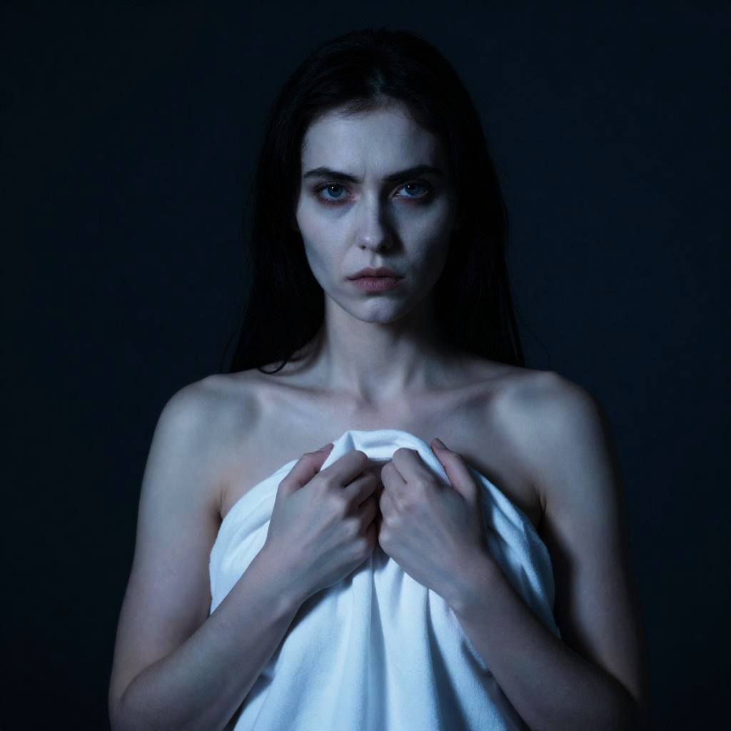 Photograph of a woman with pale skin and dark hair, illuminated by blue light, holding a white cloth over her chest. Dark background, intense facial expression, shadow on left side, upper body centered.