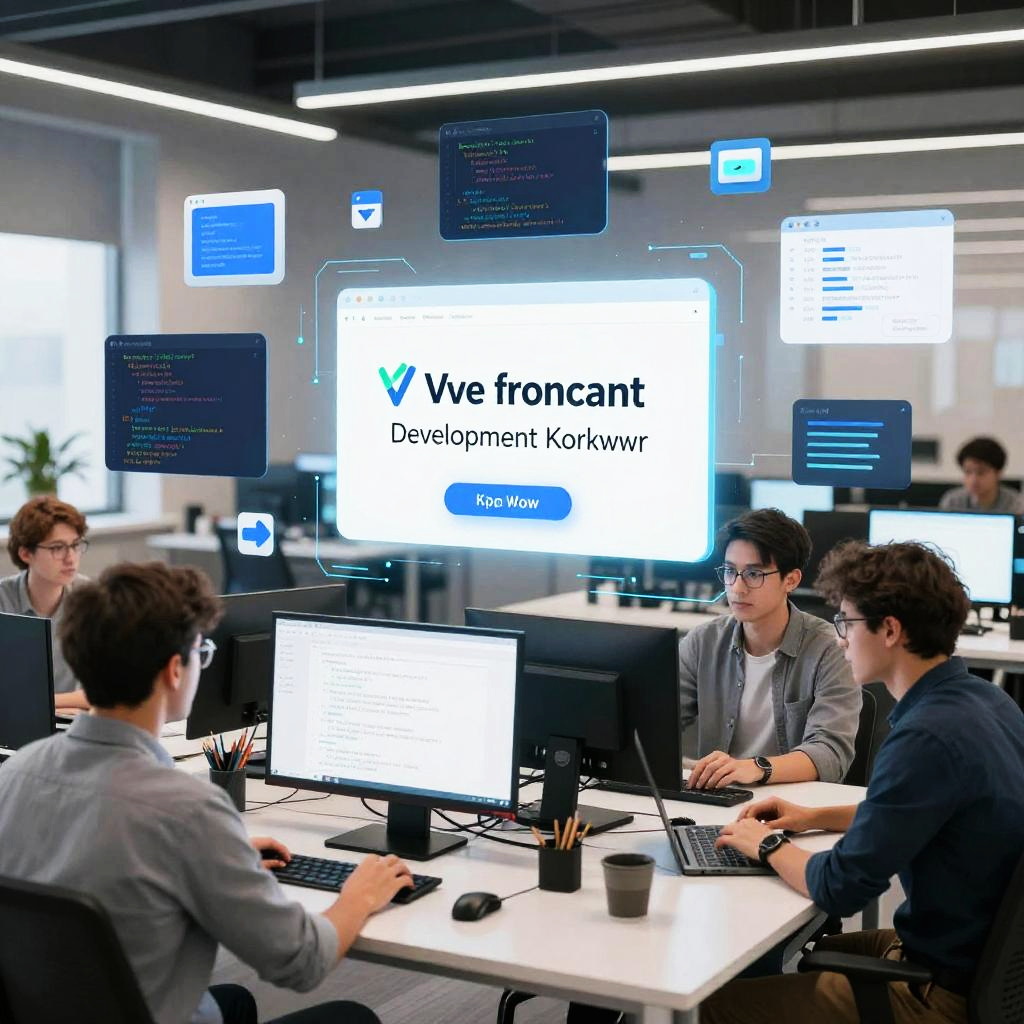 Vue frontend development workflow, a team of developers collaborating remotely via holographic interfaces, code and UI animations floating in 3D space, cool blue and white color scheme, tech startup atmosphere, cutting-edge technology and innovation emphasis