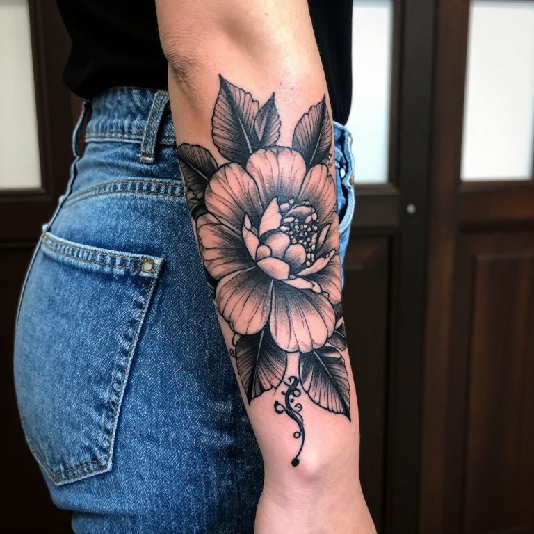 A black and gray tattoo on a person's forearm features a detailed, symmetrical design of a butterfly with outstretched wings covering a woman's face, lips slightly parted. Below the face, a large flower with a central pattern and smaller flowers hang down. The tattoo has a realistic, shaded style. The person is wearing blue jeans and white sneakers, standing on a concrete surface.