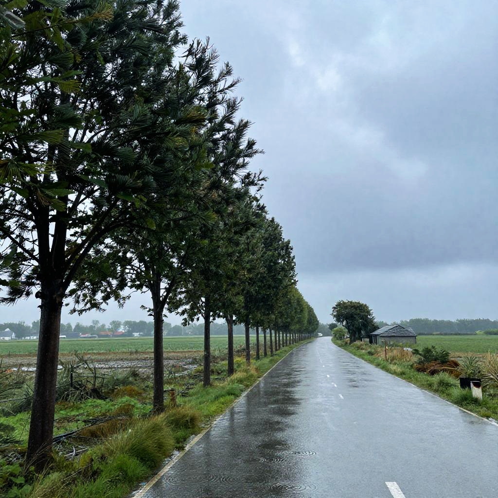 Rainy day landscape depicting a countryside road lined with tall trees swaying in the wind, rain pouring down creating ripples on puddles, overcast sky with dark clouds, a small cottage visible in the distance, cinematic realism.