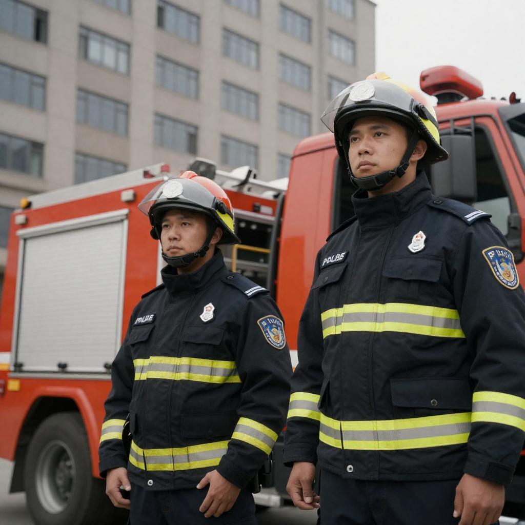 Photograph of two male police officers in black uniforms and helmets standing in front of an orange fire truck. The officer on the left is seated, while the one on the right stands. A tall, gray, multi-story building is in the background. Both officers have serious expressions.
