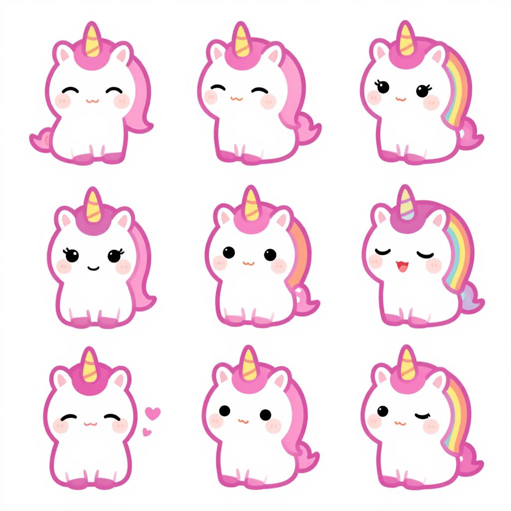 This digital drawing features a grid of nine adorable, cartoon-style unicorn characters with white bodies and pink manes and tails. Each unicorn has a yellow horn and is depicted in various cute expressions. The unicorns have large, black, expressive eyes, and some have small, blushing pink circles on their cheeks. Each unicorn has a distinct expression: smiling, winking, with a rainbow mane, with a heart next to their head, with a rainbow mane and a tongue out, and more. The background is plain white, making the colorful unicorns stand out. The style is kawaii (Japanese for cute), with a focus on simplicity and charm.