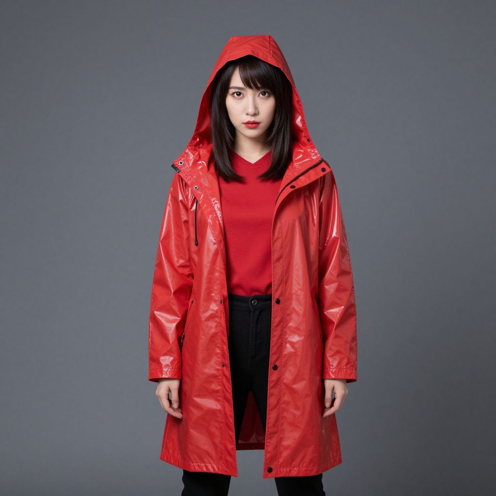 Photograph of a young Asian woman with straight black hair, wearing a vibrant red, glossy raincoat with a hood, red sweater, and black pants