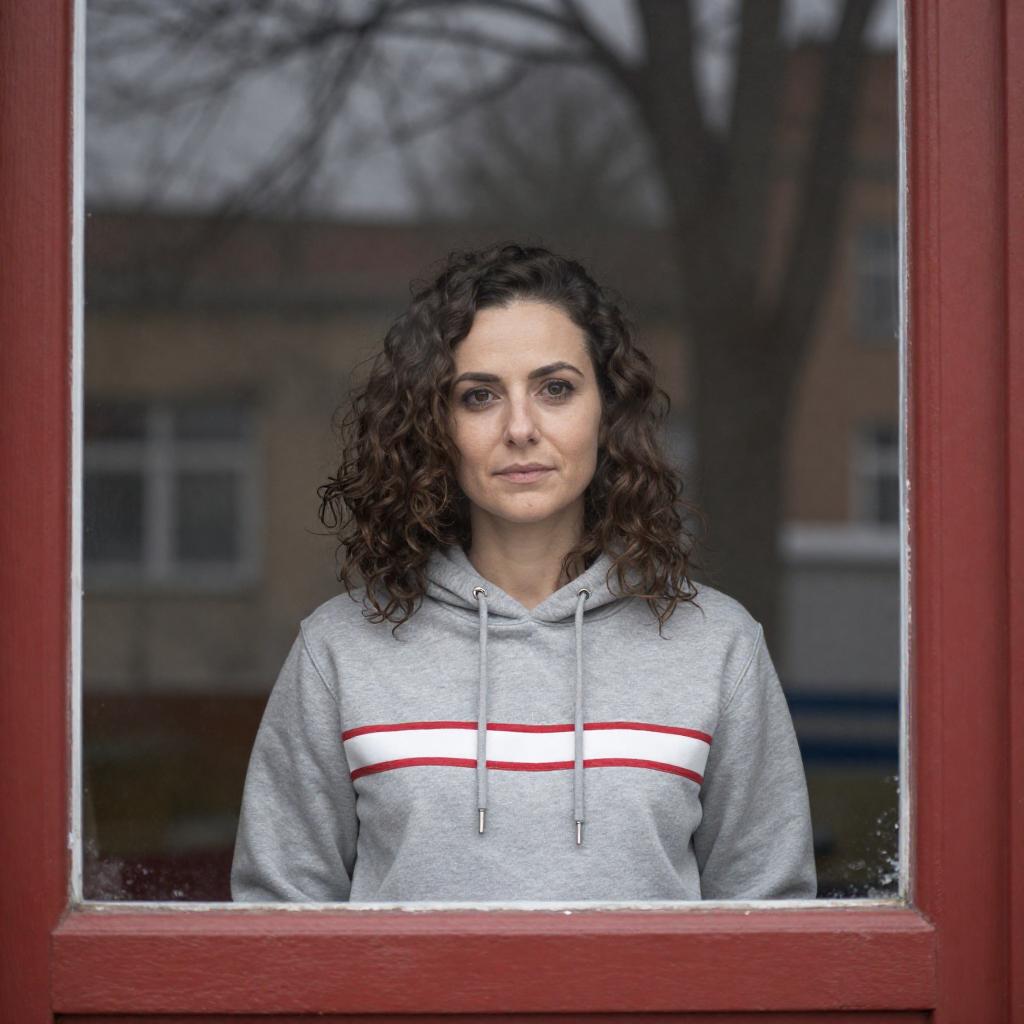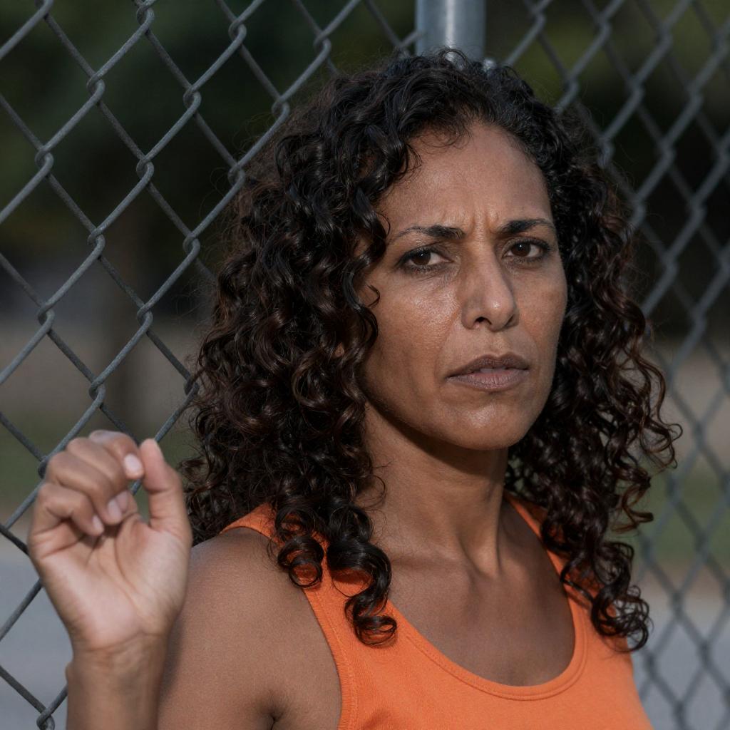 Photograph of a middle-aged woman with short black hair, wearing a sleeveless black top and black pants, sitting on a green chair against a gray wooden wall. She has a serious expression, with her hands resting on her knees. A red door is on the right, and a black grill is on the ground to the right of the chair.