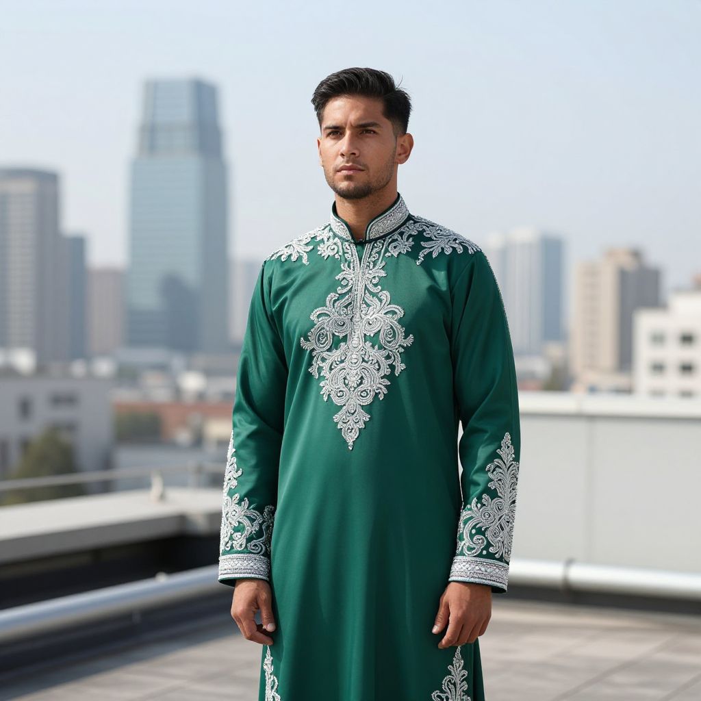 A man stands confidently on a rooftop overlooking a modern city skyline, dressed in a luxurious green traditional robe adorned with intricate silver embroidery. The outfit blends cultural heritage with a contemporary urban backdrop, highlighting a sense of pride and tradition in a modern world.