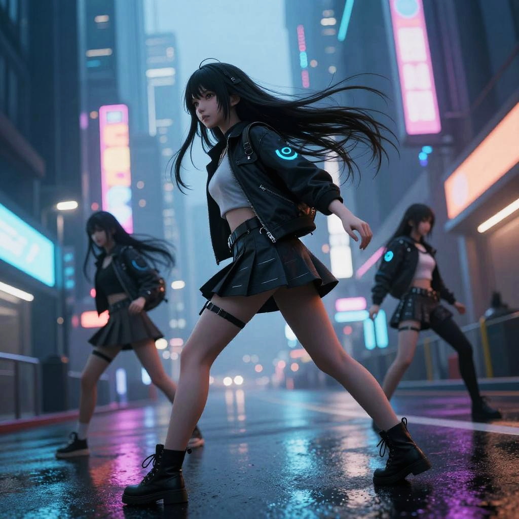 Long haired anime girls in futuristic cityscape at night, neon lights reflecting on wet streets, dynamic action poses, intricate hair strands waving, cyberpunk aesthetic