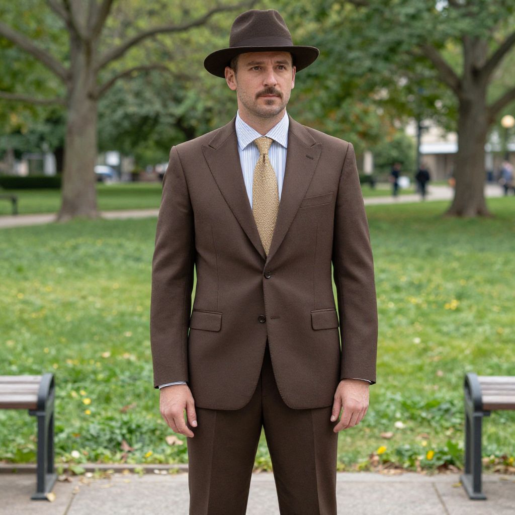 Role Play Costume Man, man in a brown suit and hat standing in a park