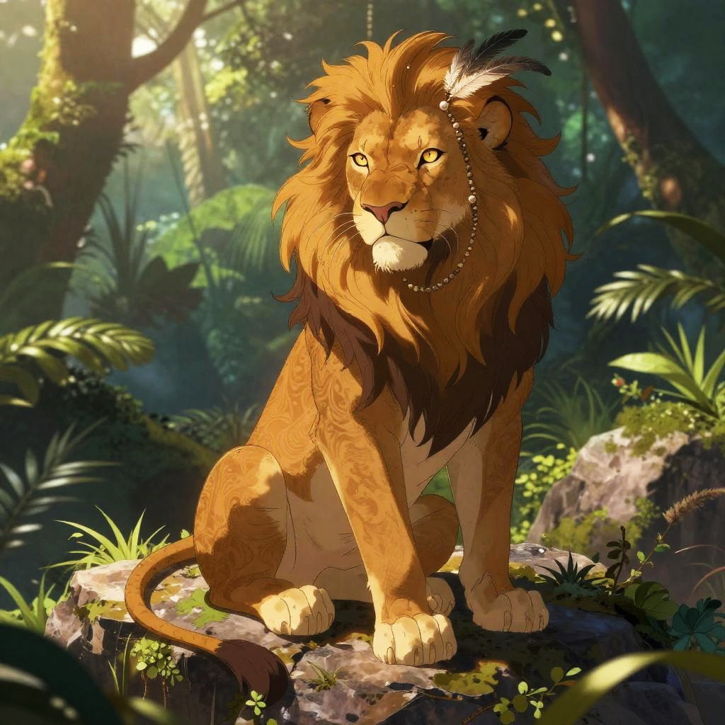 Anime lion girl leaping through an enchanted jungle, powerful muscles visible beneath detailed fur, mane flowing wildly, sharp claws extended, vibrant green foliage contrasting with rich golden tones, dynamic motion blur effect, epic fantasy action scene