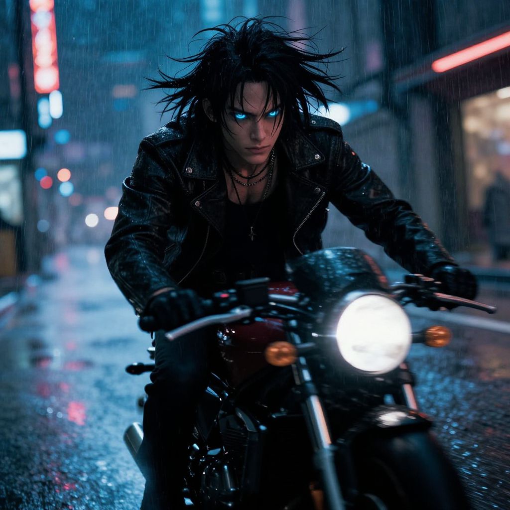 Long black hair anime man with piercing blue eyes, wearing a leather jacket, riding a motorcycle through a rainy neon-lit street, anime style with gritty cyberpunk vibes, dynamic motion blur, moody atmosphere, vibrant reflections on wet asphalt.