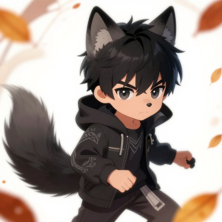 Black hair cute anime wolf boy in dynamic pose, sharp wolf ears and tail, wearing modern casual clothes with subtle tribal patterns, surrounded by swirling autumn leaves, intense gaze and youthful charm, detailed fur texture and anime shading techniques.