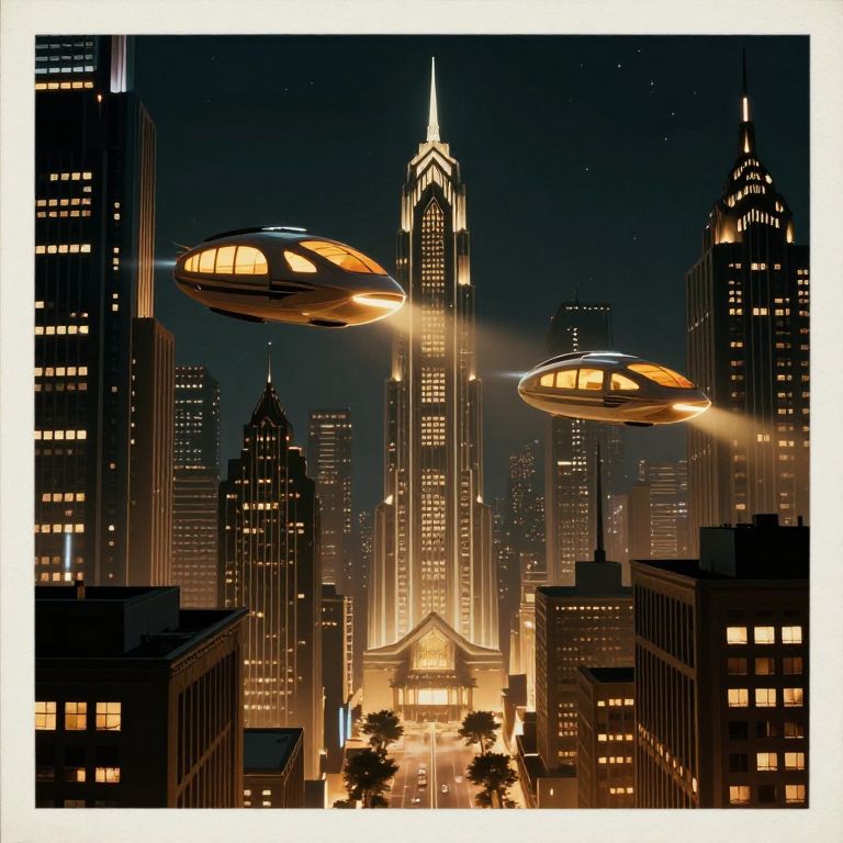 The image depicts a futuristic cityscape at night, reminiscent of the Deco style of the 1920s, with a postcard border. Two flying cars, glowing with a warm yellow light, are suspended above the city, one on the left and the other on the right, creating a sense of symmetry. The cars are sleek and rounded, with large windows and a streamlined design, contrasting with the dark, tall buildings below. The buildings are adorned with Art Deco elements, such as spires and geometric patterns, and are illuminated with a soft, warm light that casts a glow on the streets below. The streets are lined with tall, modern skyscrapers, their windows twinkling like stars. The overall composition is balanced, with the flying cars and the cityscape arranged in a harmonious manner, creating a sense of wonder and excitement. The image captures the essence of a futuristic city, where technology and architecture blend seamlessly, creating a vision of a utopian future.